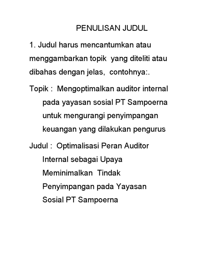 Bagaimana penggunaan preposisi dalam sebuah teks? Mana yang paling sesuai dengan kaidah bahasa indonesia yang baik dan benar? Melalui judul inilah calon pembaca bisa menilai apakah isinya bagus atau tidak, menarik atau tidak, sesuai kebutuhan atau tidak, dan lain. Bagaimana contoh penulisan daftar pustaka dalam bahasa indonesia untuk berbagai jenis pustaka? Penentuan judul yang tepat dan penulisan yang benar tidak hanya membutuhkan rangkaian kalimat yang unik, menarik, dan kontekstual, tetapi juga rapi dan sesuai kaidah.
